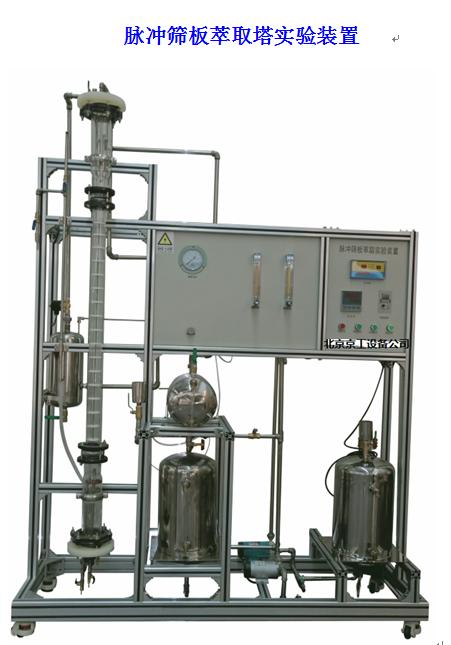 篩板萃取塔,塔兩端直徑較大部分為上澄清段(油水分離)和下澄清段。中間為兩相傳質(zhì)段,在塔的下澄清段裝有脈沖管和輕相分布器;在上澄清段設(shè)有重相分布器、輕相出口以及緩沖器。萃取操作時(shí),由脈沖發(fā)生器提供的脈沖氣流使塔內(nèi)液體作上下往復(fù)運(yùn)動(dòng),迫使液體經(jīng)過篩板使分散相破碎成較小的液滴分散在連續(xù)相中,并形成強(qiáng)烈的上下湍動(dòng),從而促進(jìn)傳質(zhì)過程的進(jìn)行。玻璃篩板塔:直徑Ф60mm,有效高 1000mm,板間距50~100mm;上、下擴(kuò)大段直徑Ф100mm,高300~500mm。