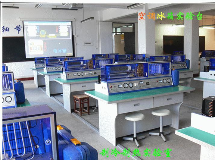 制冷制熱實(shí)驗(yàn)室設(shè)備是新經(jīng)較大規(guī)模地升級(jí)而完成的 實(shí)驗(yàn)臺(tái) 。 新增加其它類型的空調(diào)、冰箱系統(tǒng)及電路十幾個(gè)機(jī)種,有利于學(xué)生更全面地掌握制冷、 制熱技術(shù)。分體空調(diào)為立體結(jié)構(gòu):前面為仿真室內(nèi)機(jī)組,后面為仿真室外機(jī)組,室內(nèi) 機(jī)組改進(jìn)為真實(shí)空調(diào)組件,外套真空調(diào)全透明外殼。冰箱方面也進(jìn)行了結(jié)構(gòu)上的改進(jìn), 前后格分開:前面為冷凍室,后面為電冰箱壓縮機(jī)、工作室等。 另外,為了克服冰箱、空調(diào)溫度顯示的問題,第六代產(chǎn)品增加了巡回檢測數(shù)碼溫 度顯示系統(tǒng),可以很直觀地觀察制冷及制熱系統(tǒng)中各關(guān)鍵點(diǎn)的溫度,并以數(shù)字的形式 顯示。