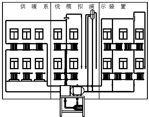 模擬采暖散熱器片、采暖供水干支管道、回水干支管道、集氣罐、高位膨脹水箱、溢水管、信號(hào)管、循環(huán)管、排水管、膨脹管、模擬房間墻面、模擬供暖鍋爐、供水泵、供水箱、實(shí)驗(yàn)臺(tái)框架等。