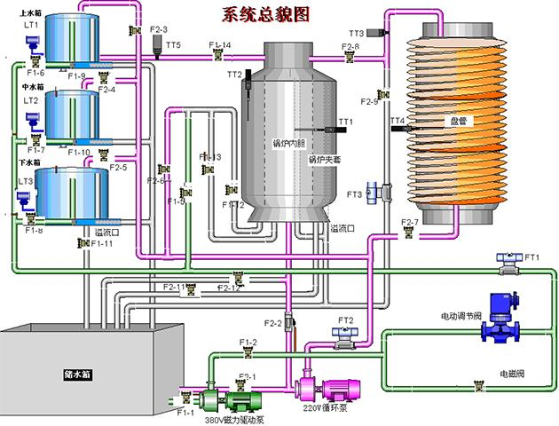 實驗對象系統(tǒng)包含有:不銹鋼儲水箱;上、中、下三個串接有機玻璃圓筒型水箱;三相4.5kW電加熱鍋爐(由不銹鋼鍋爐內(nèi)膽加溫筒和封閉式外循環(huán)不銹鋼冷卻鍋爐夾套構(gòu)成)和鋁塑盤管組成。