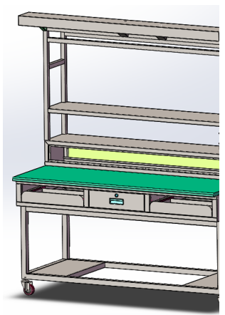 計算機組裝與維護實訓裝置要求采用雙工位結構設計,共兩層,其中第一層可放置維修工具、套件、儀器儀表;第二層可放顯示器,頂部設有30W日光燈一盞和風扇一臺。實訓臺設有一個抽屜、兩個鍵盤托架、兩個主機柜,下方設有四個剎車的萬向輪。