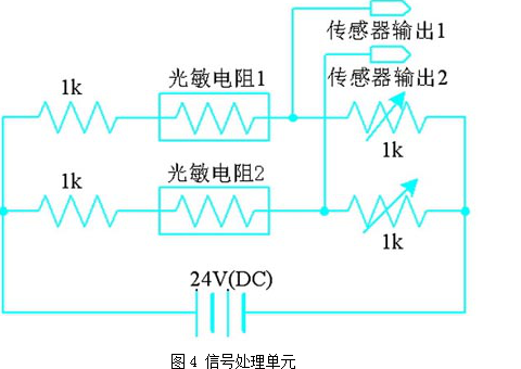 圖4所示為信號處理單元電路,當太陽輻射強度增加時,光電電阻阻值減小,1k可變電阻的壓降增加,從而產(chǎn)生與太陽光輻射強度有直接關(guān)系的電壓信號。兩個傳感器的輸出信號與plc模擬輸入端口連接,并對這兩個模擬信號進行比較運算,從而輸出正確的信號,以驅(qū)動太陽能電池板跟蹤系統(tǒng)的電磁機構(gòu)。