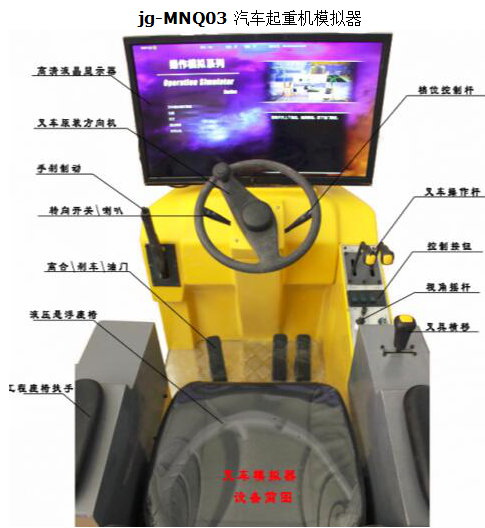 該設備硬件由懸浮式座椅、駕駛座艙、底座平臺、PC系統(tǒng),視景顯示器,方向機,檔位桿,操作手柄,IC卡讀寫裝置、360視角調整搖桿、油門、離合、剎車踏板,轉向開關,數據采集卡、中樞控制臺及各種功能控制按鈕組件等組成。設備采用與真實汽車起重機相同的操作部件,逼真的操作手感,使得其操作功能、操作感覺與真機完全吻合;