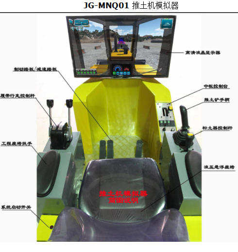 該設(shè)備硬件由設(shè)備底座、駕駛座艙、設(shè)備座椅、PC系統(tǒng)、視景顯示器、轉(zhuǎn)向控制桿、IC卡讀寫器、360度視角搖桿、制動(dòng)踏板、減速踏板、松土器控制桿、數(shù)據(jù)采集系統(tǒng)及各種功能按鈕等組成。設(shè)備采用與真實(shí)推土機(jī)相同的操作部件,逼真的操作手感,使得其操作功能、操作感覺與真機(jī)完全吻合;