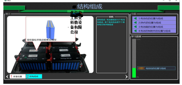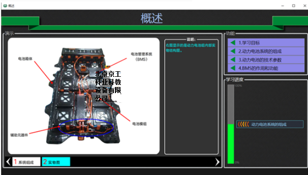 3.1、概述:主要講述本教學(xué)軟件的學(xué)習(xí)目標(biāo)、動力電池系統(tǒng)的組成、動力電池的技術(shù)參數(shù)及BMS的作用和功能等,引入BMS系統(tǒng)的教學(xué)內(nèi)容。