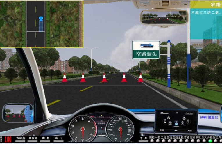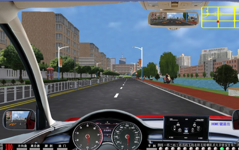 軟件主界面 :?jiǎn)?dòng)畫面后, 界面下方同時(shí)顯示:油門、剎車、轉(zhuǎn)向、離合器 深淺進(jìn)度均有顯示 。 視景 120 度全新廣角寬頻駕駛模擬,界面顯示 各項(xiàng)指示燈、文字提示框、檔位位置 、訓(xùn)練成績(jī),后視鏡(左、右、中)后視鏡可調(diào)節(jié)、訓(xùn)練線路圖均有顯示。