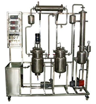 本裝置由提取罐、蒸發(fā)器、攪拌電機(jī)、列管式加熱器、冷凝器、油分器、收油器、藥液泵、貯液罐、過(guò)濾器、真空泵、調(diào)速器、數(shù)顯溫度儀、不銹鋼框架、控制屏等組成。提取罐、蒸發(fā)器配導(dǎo)熱油加熱系統(tǒng),提取罐、蒸發(fā)器頂部蒸汽出口均設(shè)置了除沫器。