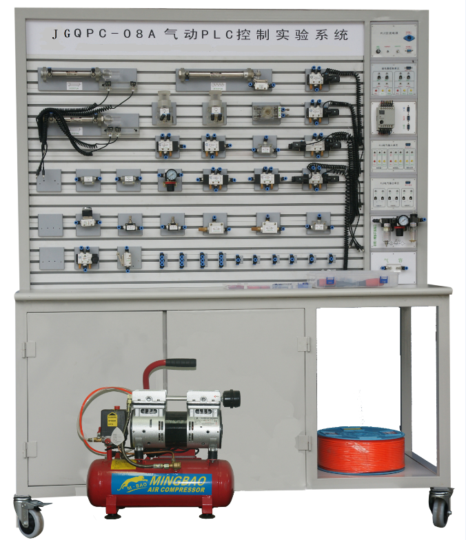 JGQPC-08A型氣動(dòng)PLC控制實(shí)驗(yàn)臺(tái)主要由實(shí)驗(yàn)工作臺(tái)、電氣控制器件、氣動(dòng)元器件、氣源、工具附件等部分組成: