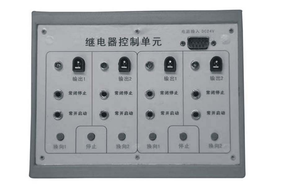 利用每組的測試按鈕作為主令按鈕,同時為繼電器控制模塊提供兩個常開啟動信號、兩個常閉信號。利用每組的輸入插孔,對接入的觸點開關信號進行轉(zhuǎn)換及擴展。并可以輸入三線傳感器信號(正電源、負電源、信號)。
