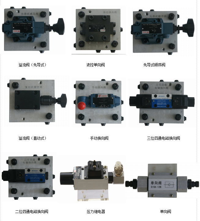 壓力表,溢流閥,節(jié)流閥,單向閥,液控單向閥,調(diào)速閥,順序閥,減壓閥,雙作用油缸,二位四通電磁換向閥,二位三通電磁換向閥,二位二通電磁換向閥,“O”型三位四通電磁換向閥,“Y”型三位四通電磁換向閥,壓力繼電器等。