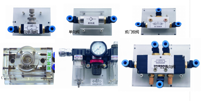 減壓閥,手動換向閥,電磁換向閥,氣控換向閥,行程閥,單向閥,節(jié)流閥、單向節(jié)流閥、快速排氣閥,或門型梭閥,單作用氣缸,雙作用氣缸、旋轉(zhuǎn)氣缸,行程開關(常閉、常開)等。