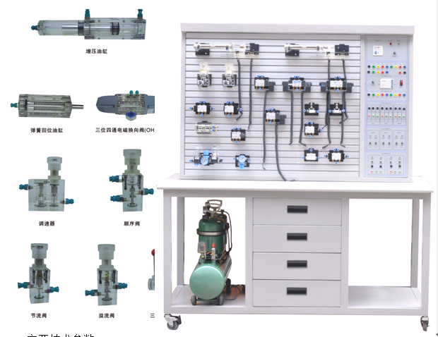 4 、實(shí)訓(xùn)元件均為透明有機(jī)材料制成,便于了解掌握幾十種常用液壓元件的結(jié)構(gòu),性能及用途。掌握幾十種基本回路的工作原理,實(shí)驗(yàn)組裝回路快捷、方便。
